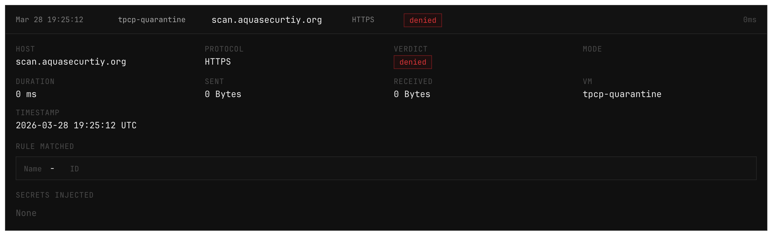 | Exfil to C2 | Encrypted payload reaches scan.aquasecurtiy.org | Blocked at the egress firewall |